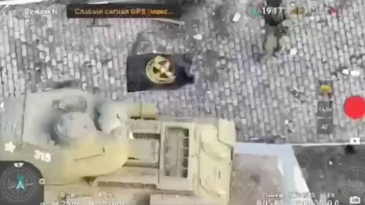 На кадрах, геолокованих CNN, видно, як до пам'ятника біжать чотири бійці. Вони знімають український прапор, встановлений на стовбурі танка, та розміщують на танку прапор "групи Вагнера". Потім видно, як бойовики піднімають зброю у повітря та підпалюють український прапор.