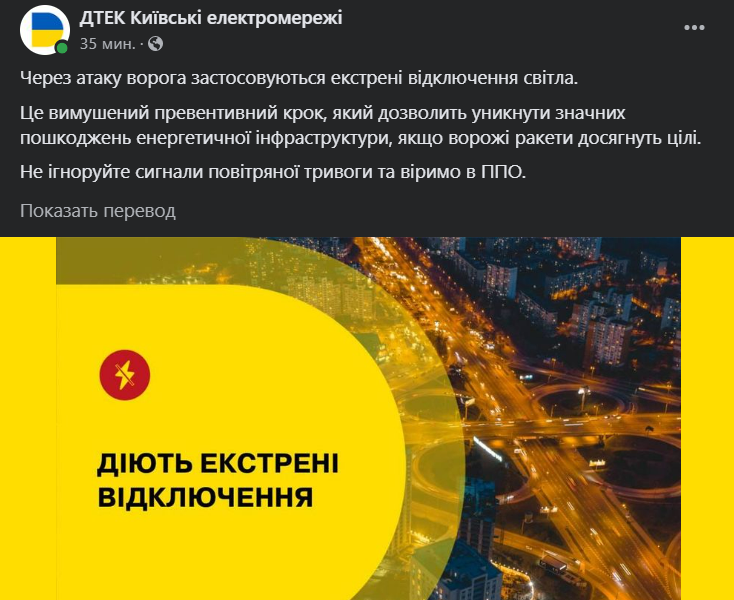 "Через атаку ворога застосовуються екстрені відключення світла. Це вимушений превентивний крок, який дозволить уникнути значних пошкоджень енергетичної інфраструктури, якщо ворожі ракети досягнуть мети. Не ігноруйте сигнали повітряної тривоги і віримо в ППО", - йдеться у повідомленні компанії.