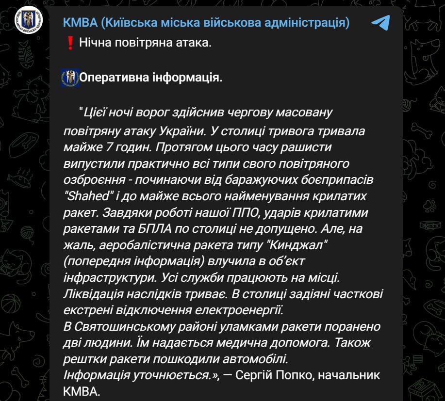 07:58 Удар по об'єкту інфраструктури у Києві завдали ракетою "Кинжал", заявив начальник військової адміністрації столиці Сергій Попко.