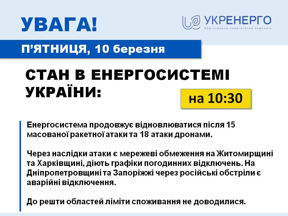 10.45 У Житомирі та Харкові частина споживачів, як і раніше, залишаються без електропостачання після вчорашньої ракетної атаки, повідомляє "Укренерго".