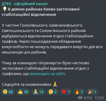 12.04 У деяких районах Києва застосовуються стабілізаційні відключення, повідомляють у ДПЕК.