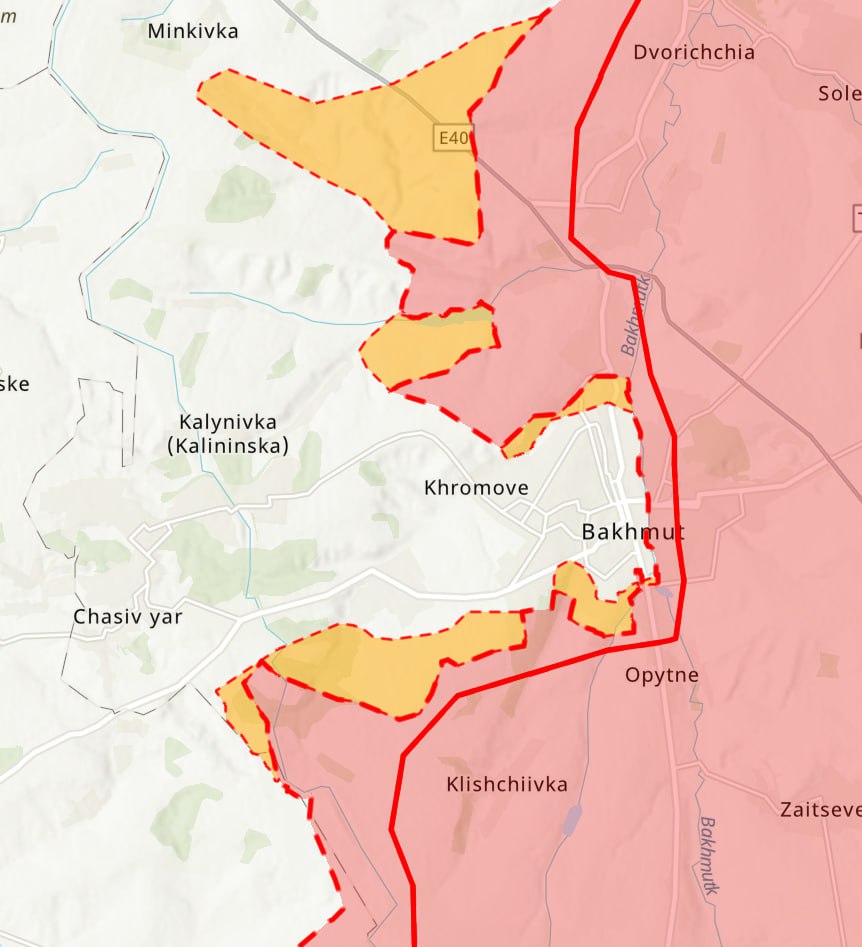 За її даними, українські сили утримують західну частину міста та зруйнували ключові мости через річку, що протікає з півночі на південь через смугу відкритої місцевості завширшки 200–800 метрів. Оскільки українські підрозділи можуть вести вогонь із укріплених будівель у західній частині міста, цей район перетворився на зону бойових дій, що, ймовірно, створить велику проблему для сил "Вагнера", які намагаються продовжити лобовий наступ у західному напрямку.