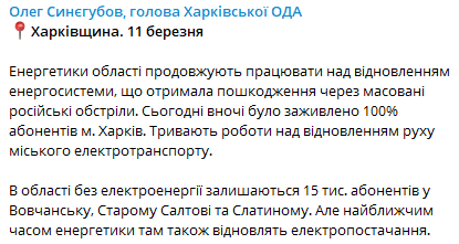 У Харкові сьогодні вночі підключили до електроенергії 100% абонентів. Продовжуються роботи щодо відновлення руху міського електротранспорту.