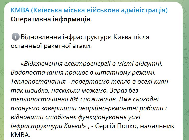 "Наразі без теплопостачання 8% споживачів. Сьогодні плануємо завершити аварійно-ремонтні роботи та відновити стабільне функціонування всієї інфраструктури Києва", - заявив голова КДВА Сергій Попко.