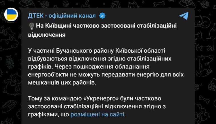 За даними ДПЕК, електрика зникла у частині Бучанського району – за стабілізаційними графіками.