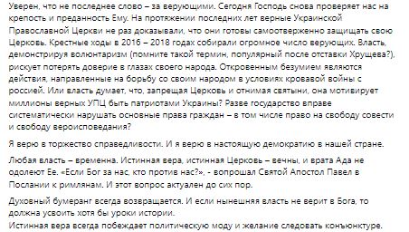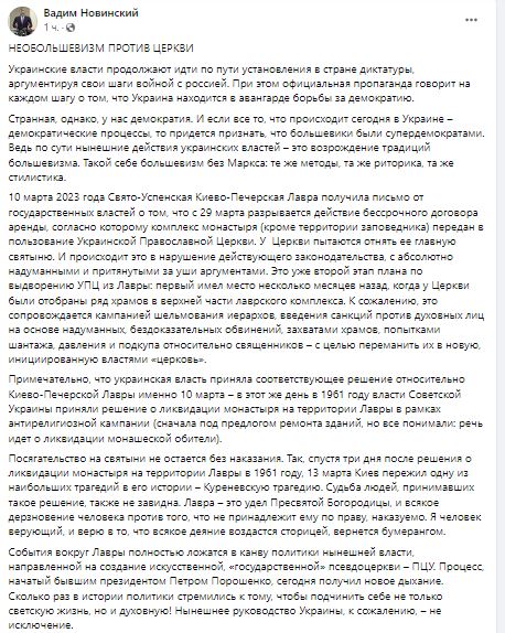 "Протягом останніх років вірні Української Православної Церкви неодноразово доводили, що вони готові самовіддано захищати свою Церкву. Хресні ходи у 2016 – 2018 роках збирали величезну кількість віруючих. Влада, демонструючи волюнтаризм (пам'ятаєте такий термін, популярний після відставки Хрущова)? втратити довіру в очах свого народу, відвертим божевіллям є дії, спрямовані на боротьбу зі своїм народом в умовах кривавої війни з Росією, чи влада думає, що забороняючи Церкву і відбираючи святині, вона мотивує мільйони вірних УПЦ бути патріотами України? Порушувати основні права громадян - у тому числі право на свободу совісті та свободу віросповідання? Будь-яка влада - тимчасова... Духовний бумеранг завжди повертається. І якщо нинішня влада не вірить у Бога, то має засвоїти хоча б уроки історії", - пише Новинський.