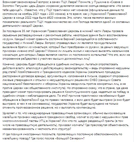 "За останні 35 років Українська Православна Церква в нижній частині Лаври провела серйозні реставраційні та ремонтні роботи, деякі будівлі були відновлені з руїн. монастиря, який був перетворений їхніми руками, за гроші віруючих парафіян саме цієї Церкви? Чи можна позбавляти житла і насильно виселяти насельників монастиря, для яких Лавра є місцем їхнього постійного проживання? – написав екс-нардеп.