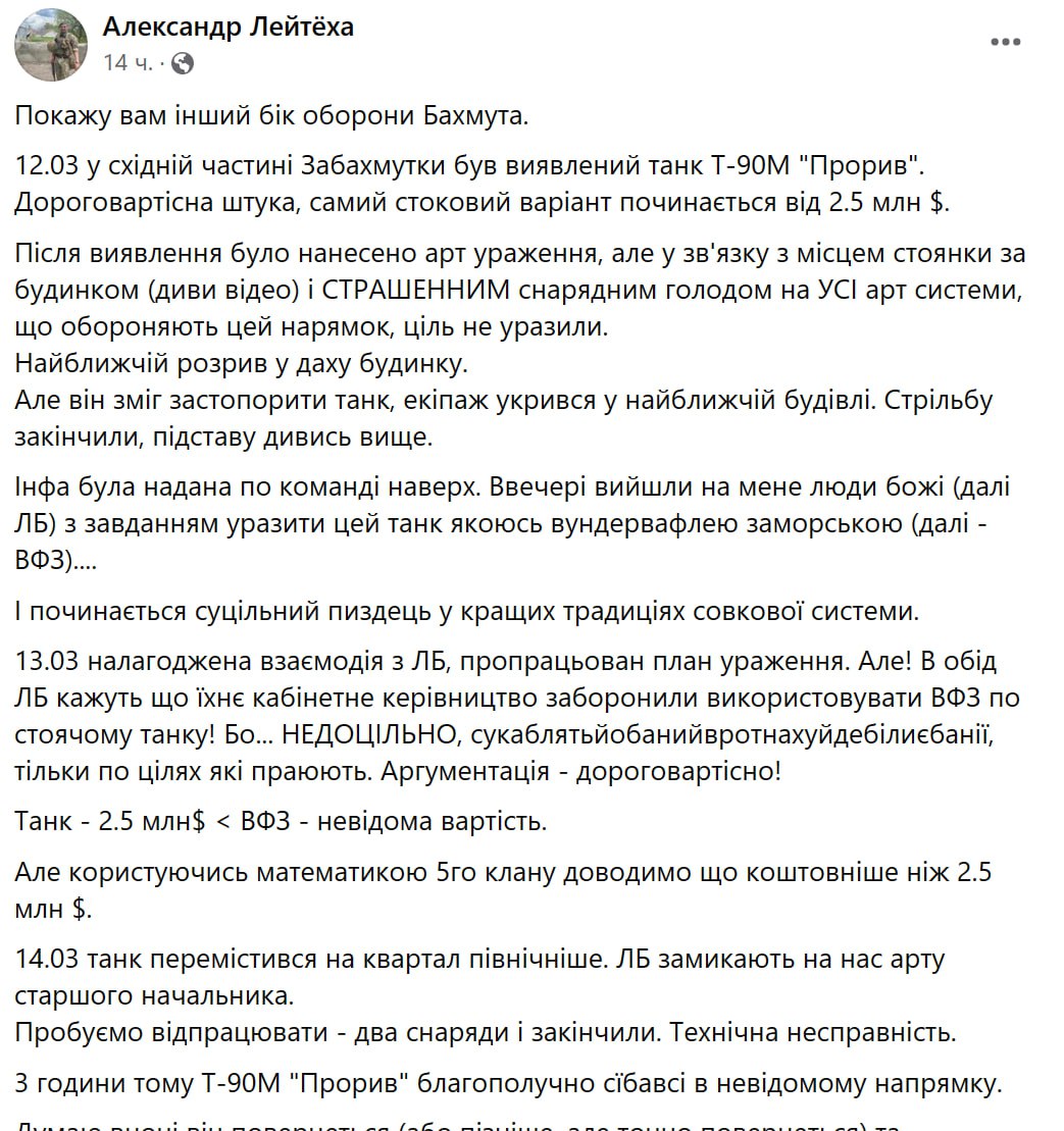 Танк було виявлено 12 березня у східній частині Забахмутки. Його спробували накрити вогнем, але російська машина стояла за будинком і вразити її не вдалося. У цьому військовий звинувачує також "жахливий снарядний голод на всі артсистеми".