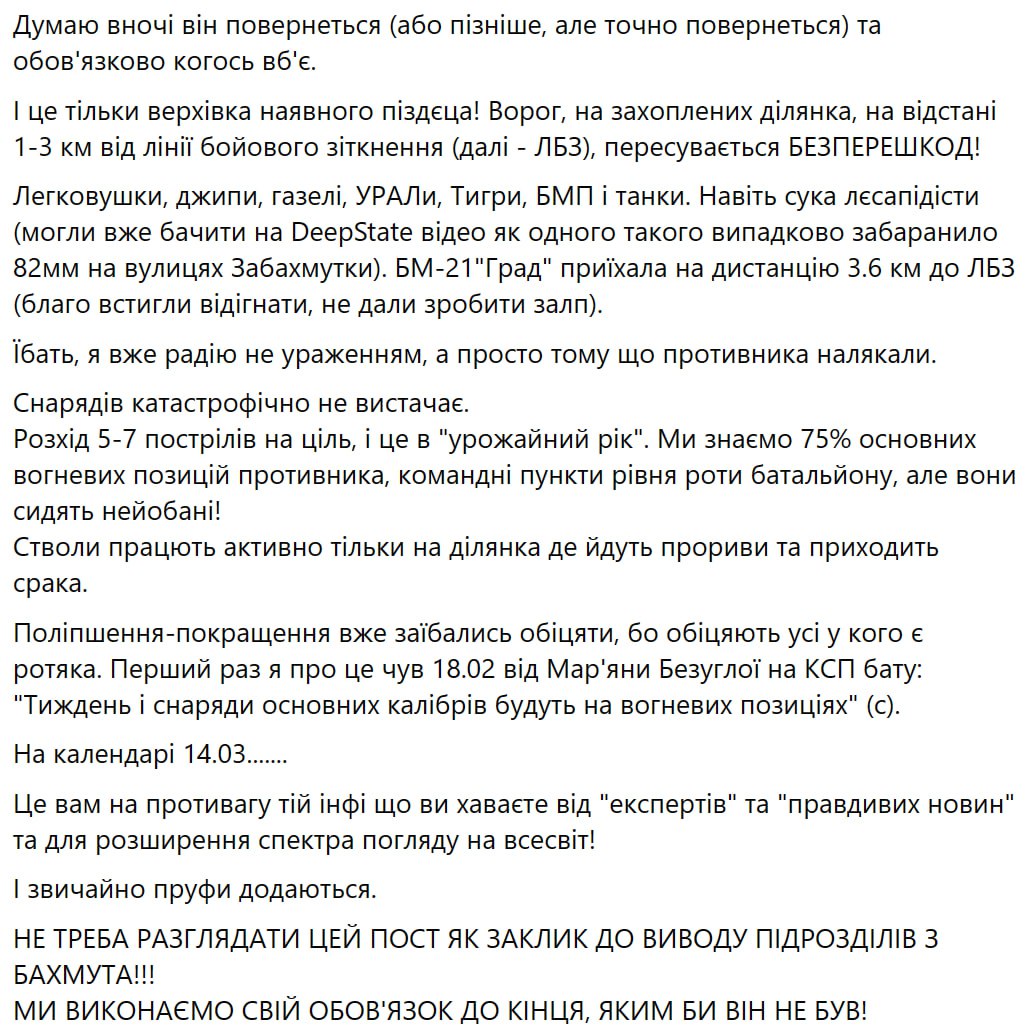 "Снарядів катастрофічно не вистачає. Витрата 5-7 пострілів на ціль, і це врожайний рік. Ми знаємо 75% основних вогневих позицій противника, командні пункти рівня роти та батальйону", але їх не обстрілюють.