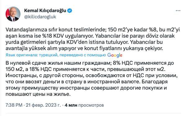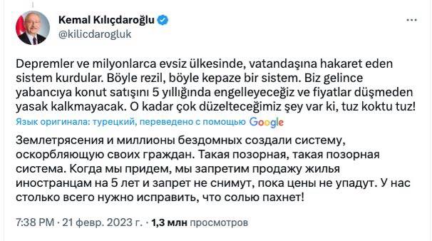 "Землетруси та мільйони бездомних створили систему, яка ображає своїх громадян. Така ганебна, така ганебна система. Коли ми прийдемо, ми заборонимо продаж житла іноземцям на 5 років і заборону не знімуть, поки ціни не впадуть. У нас стільки всього потрібно виправити, що сіллю пахне!", - заявив Киличдароглу.
