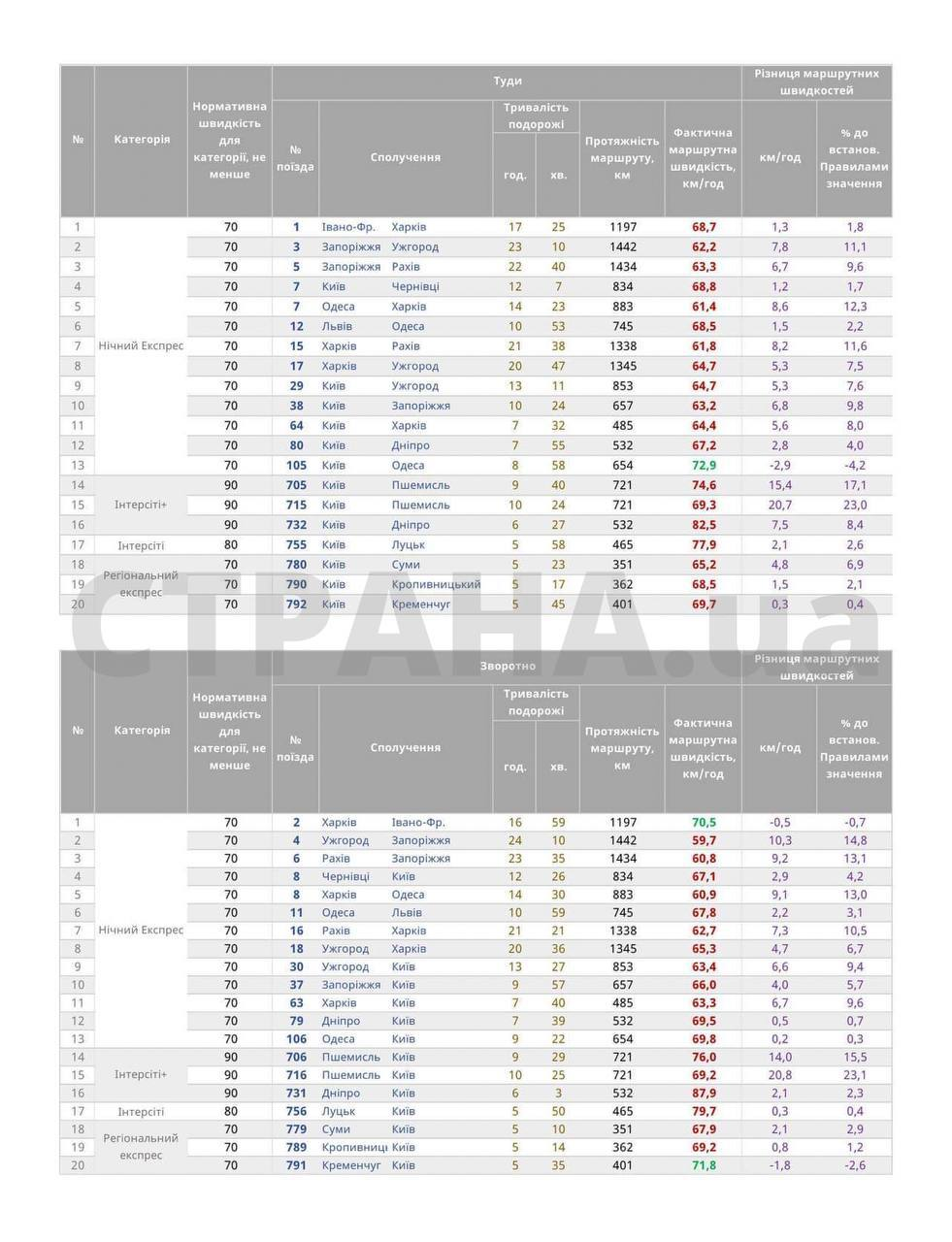 У розпорядженні "Страни" опинилася таблиця, на якій показано різницю між нормативною та фактичною швидкістю поїздів. Виходячи з неї, лише три поїзди (№105 Київ-Одеса, №2 Харків–Івано-Франківськ та №791 Кременчук-Київ) укладаються до нормативу за швидкістю руху, решта поїздів відстає. Причому цей розрив становить від 2% до 23% – як, наприклад, у випадку з поїздом Інтерсіті+ №716 Пшемисль-Київ, який для відповідності категорії Інтерсіті+ має їхати зі швидкістю 90 км/год, а за фактом рухається зі швидкістю 69 км/год.