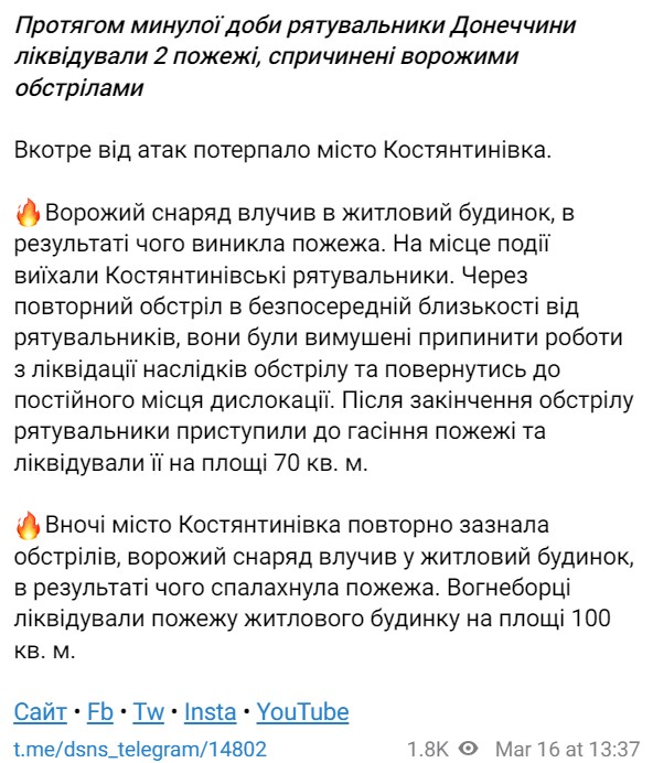 Минулої доби російські війська обстріляли Донецьку область, під ударом опинилася Костянтинівка. Там виникли дві пожежі. Рятувальники ліквідували загоряння.