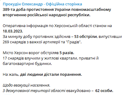 Херсон потрапив під обстріл п'ять разів. Сімнадцять російських снарядів потрапили до житлових кварталів. Пошкоджено приватні та багатоквартирні будинки.