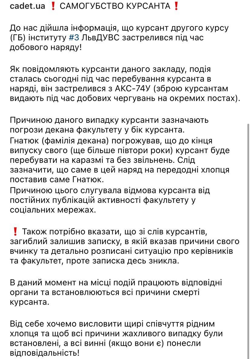 "Причиною цього випадку курсанти вказують на погрози декана факультету у бік курсанта. Гнатюк (прізвище декана - Ред.) погрожував, що до кінця випуску (понад півтора року) курсант перебуватиме на казармі і без звільнень. Слід зазначити, що саме в це вбрання напередодні парубка поставив саме Гнатюк", - пишуть у спільноті.