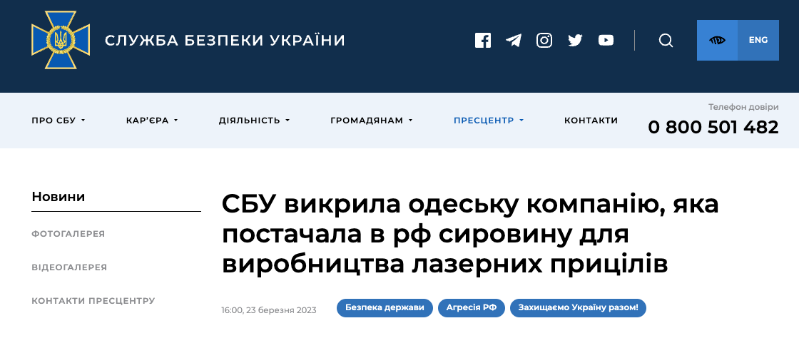 СБУ заявляє, що викрила в Одесі компанію, яка постачала Росію сировину для виробництва лазерних прицілів.