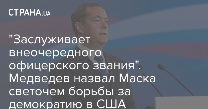 Заступник голови Ради безпеки РФ Дмитро Медведєв назвав американського бізнесмена Ілона Маска "світочком боротьби за демократію в Сполучених Штатах Америки" і заявив, що той "точно заслуговує на присвоєння позачергового офіцерського звання".