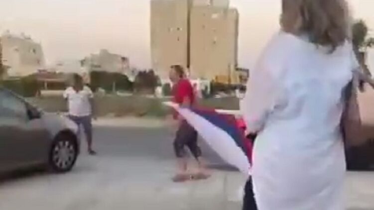 На відео, поширених у соціальних мережах, видно, як нападниця тримає в руках ножа і, хитаючись, йде до невеликої групи людей, які зібралися з прапорами РФ.
