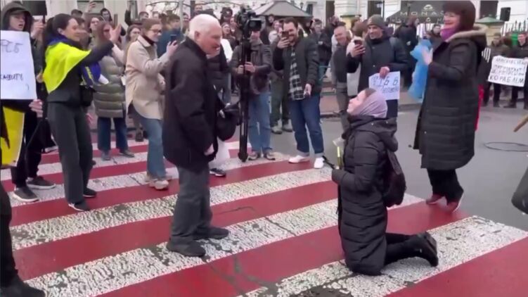 У суботу, 1 квітня, у Мережі розійшлося відео з дівчиною, яка на колінах стояла та молилася біля Києво-Печерської лаври, тоді як навколо танцювали супротивники УПЦ.