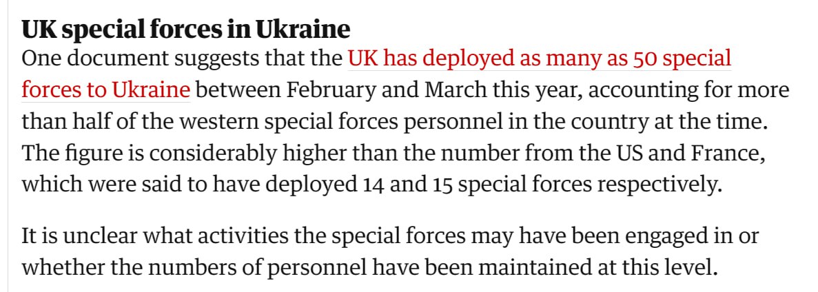 Раніше видання Economist із посиланням на витік секретних документів Пентагону, повідомило, що на території України діють спецпідрозділи кількох західних країн.