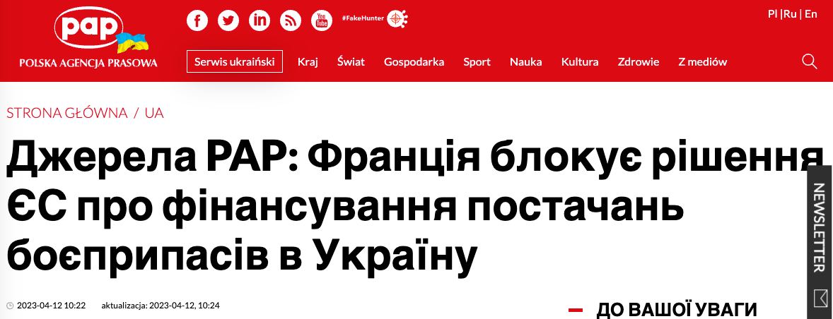 "Проти цього, проте, виступила Франція. У цій ситуації рішенням було б закупити боєприпаси у третій країні на безоплатній основі, а потім відшкодувати їх зі складів однієї із країн-членів, передавши інші озброєння третьої країни. Дискусії з цього приводу продовжуються", - цитує видання європейського урядовця.