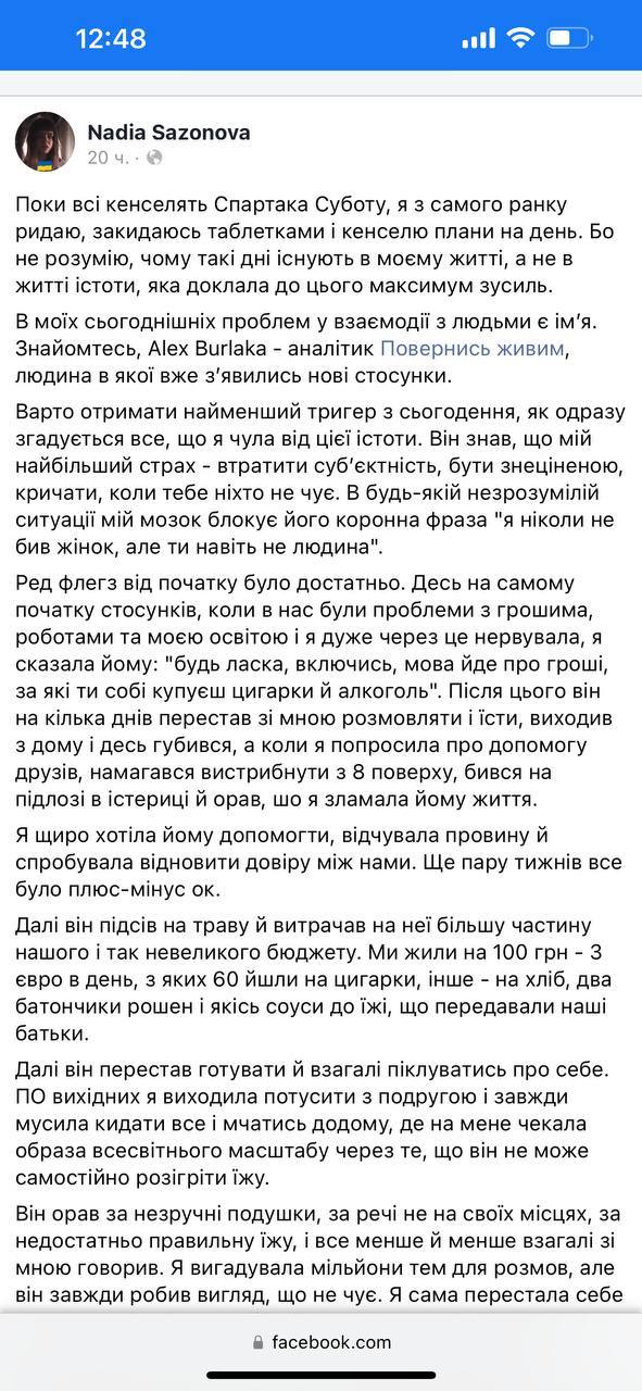 Про це у себе на сторінці у Facebook розповіла його колишня дівчина Надія Сазонова. За її словами, Бурлака бив навіть за не вимитий посуд, а також за те, що дівчина забула купити стіки для айкосу.