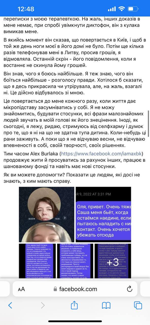 "Перед Днем незалежності він підвернув ногу і затяг мене додому з зустрічі з друзями, щоб я готувала йому їсти. Потім розкритикував мій борщ, що він недостатньо смачний. Я благала його поговорити зі мною, але це його "дістало", і він наставив мені синяків по всьому тілу.Тоді я розповіла все друзям.Вони обіцяли з ним поговорити.Але ж я розуміла, яке пекло чекає мене, коли ми знову опинимося вдвох.А через кілька днів у нашому будинку сталася пожежа, і ми змушені були шукати нове житло Увечері перед пожежею він побив мене за те, що я забула купити стіки для айкосу і змусила йти в цілодобове АТБ о дванадцятій ночі», — пише дівчина.