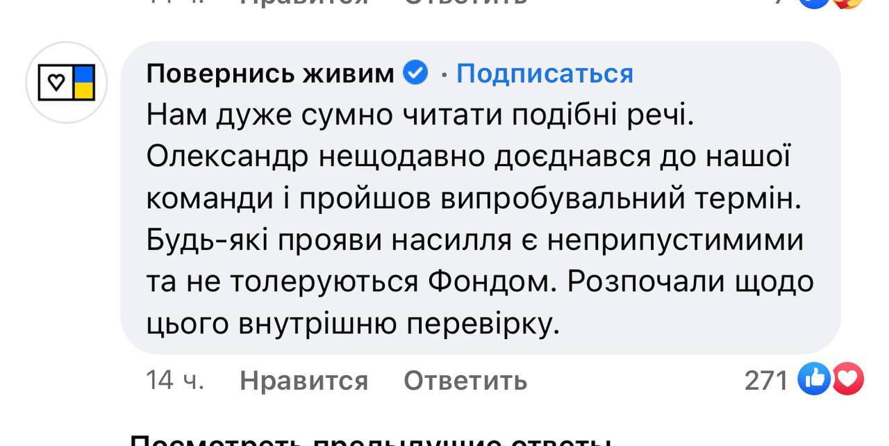 Будь-які прояви насильства неприпустимі та не толеруються у фонді. Почали щодо цього внутрішню перевірку", - написали "Повернись живим".
