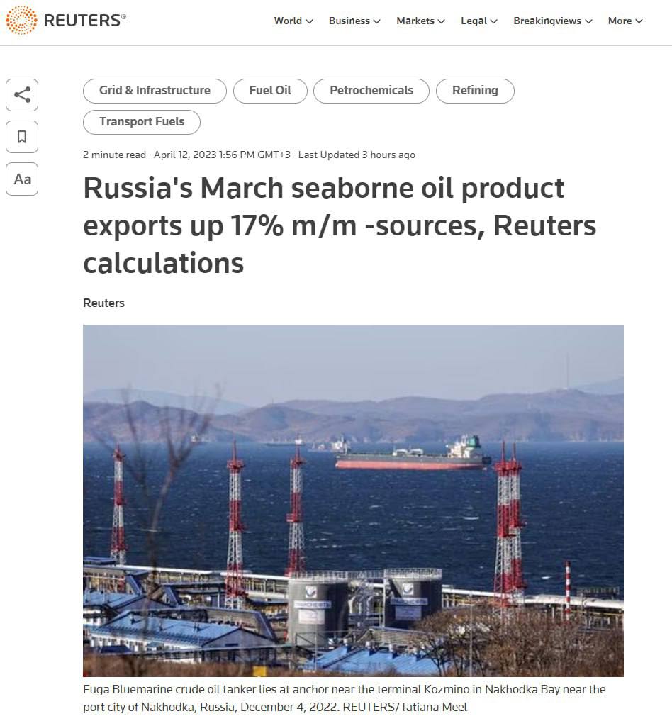 17.32 Експорт російських нафтопродуктів морем у березні зріс на 17,3% порівняно з лютим, пише Reuters.