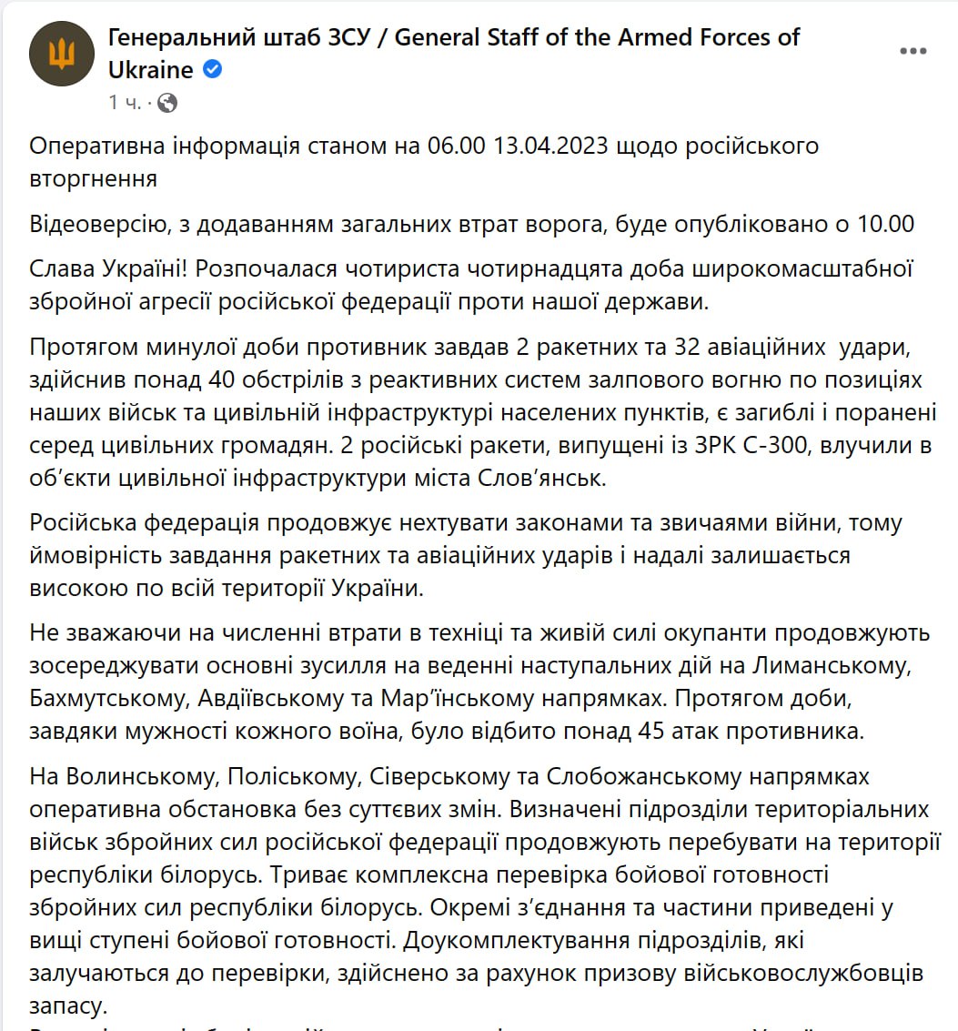 У четвер, 13 квітня, в Україні триває вже 414-й день війни з Росією
