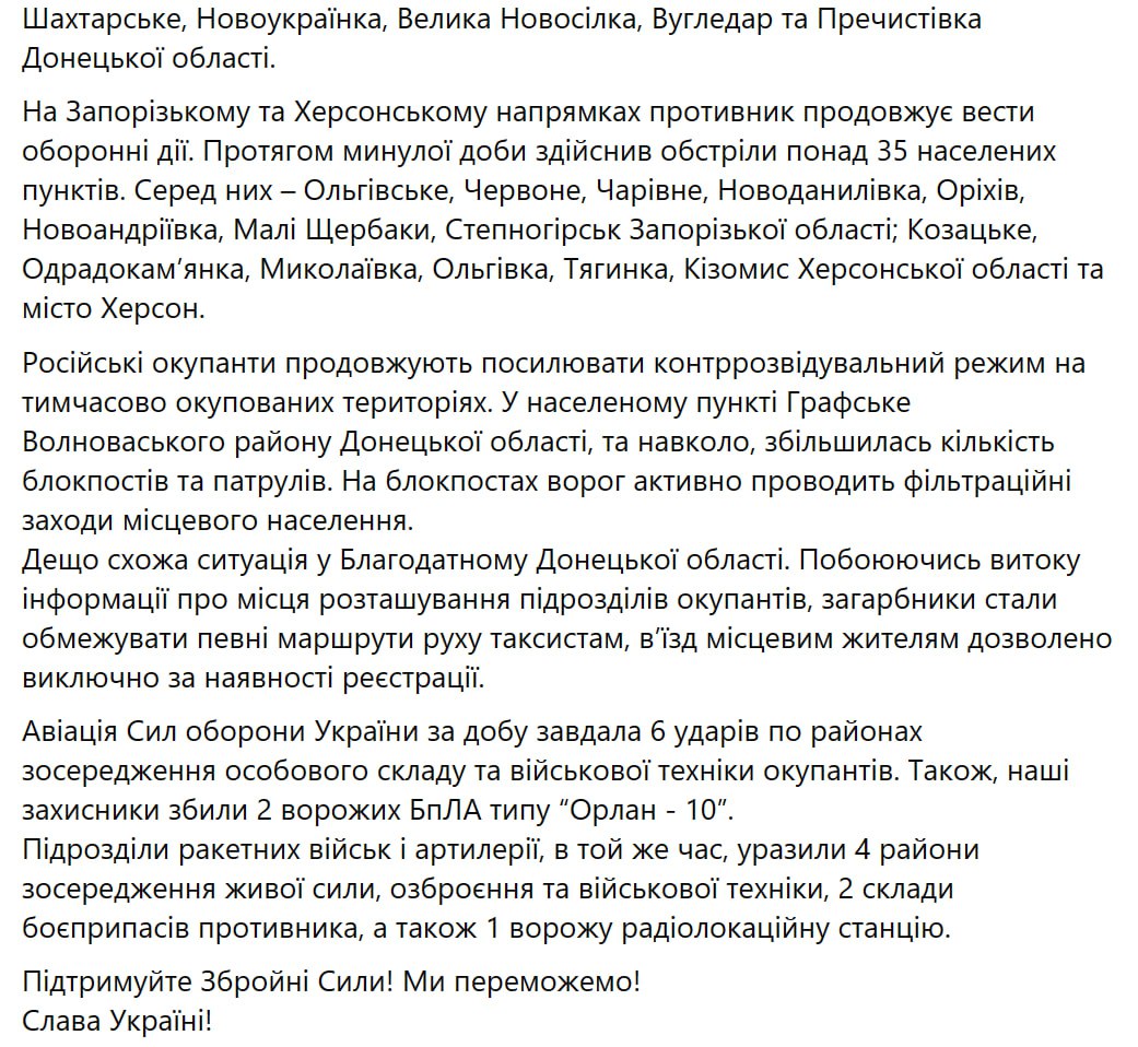 3. На Волинському, Поліському, Сіверському, Слобідському, Куп'янському, Шахтарському, Запорізькому та Херсонському напрямах ситуація без істотних змін.