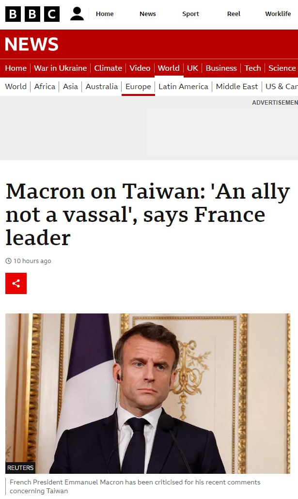 Після польоту до Китаю Макрон почав більше говорити, що Європа не повинна бути васалом США. Зокрема, в інтерв'ю Politico заявляв, що Європа має зменшити свою залежність від Сполучених Штатів та уникнути втягування у конфронтацію між Китаєм та США через Тайвань.
