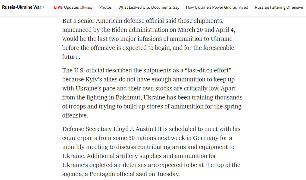 11:35 Пакети військової допомоги, про які адміністрація Байдена оголосила 20 березня і 4 квітня, - це останні великі поставки боєприпасів Україні перед очікуваним початком наступу, пише New York Times з посиланням на співрозмовників з Пентагону.