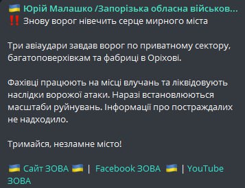 21.20 Повідомляють про вибух у непідконтрольному Мелітополі Запорізької області.