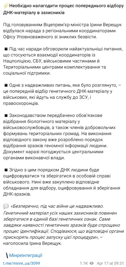 "Генетичний матеріал усіх захисників має зберігатися в єдиній базі генетичних ознак. Саме завдяки наявності генетичних зразків буде спрощено процес ідентифікації. Сподіваюся, що відповідні органи пришвидшать процес запуску цієї процедури", - повідомила віце-прем'єр міністр Ірина Верещук.