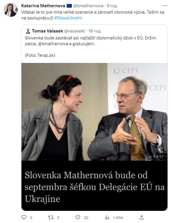 09.12 Новим послом Європейського Союзу в Україні буде призначено Катарину Матернову зі Словаччини, яка зараз обіймає посаду заступника голови Генерального директорату Єврокомісії з політики сусідства та розширення.
