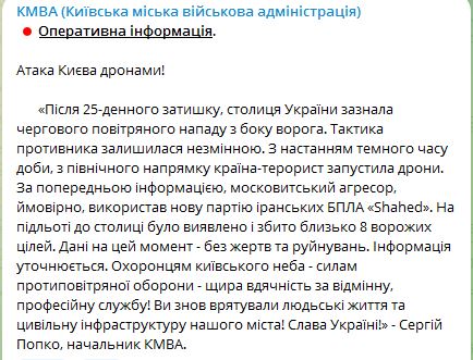Вночі РФ атакувала Київ безпілотниками. Ймовірно, то була нова партія іранських "Шахедів".