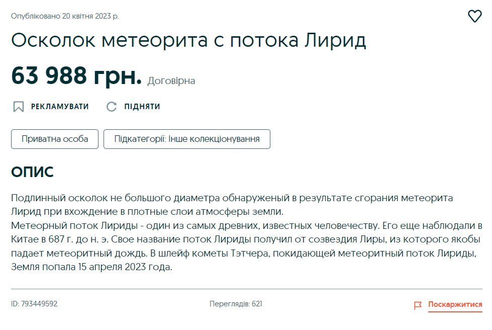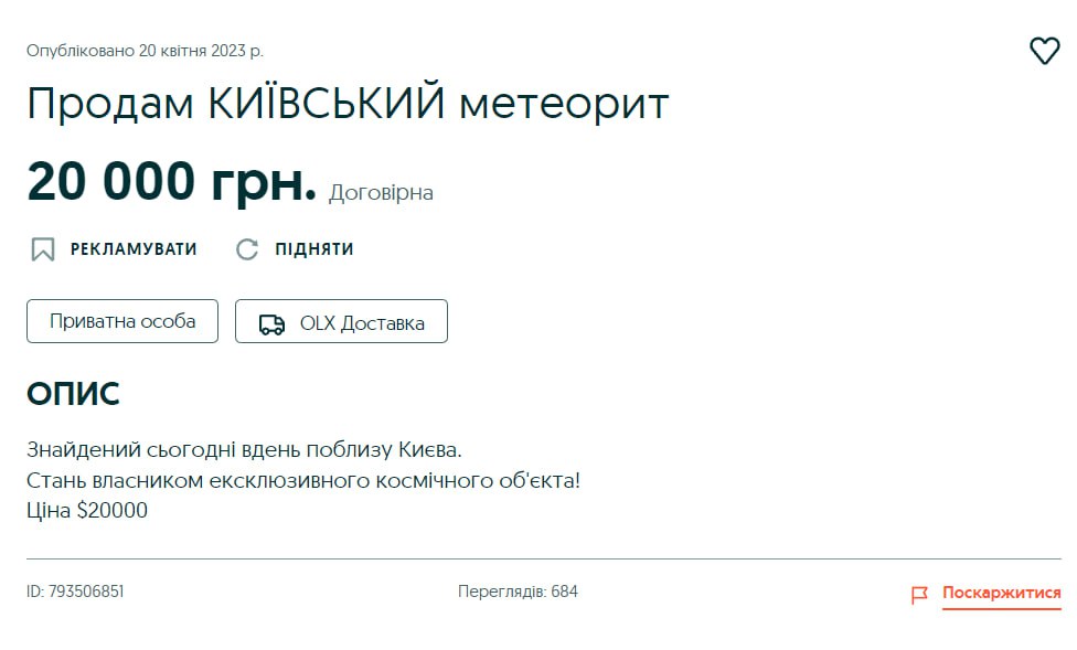 В мережі з'явилися оголошення про продаж уламків метеориту в Києві