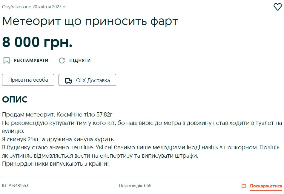 Також з'явилися жартівливі оголошення. Так, в одному з оголошень продають "метеорит, який приносить фарт".