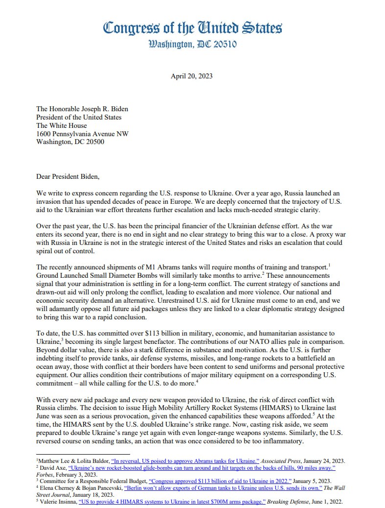 У Конгресі США група з 19 республіканців підготувала спільний лист до президента США Джо Байдена, у якому закликалаприпинити допомогу Україні у такому форматі, як це було й досі.