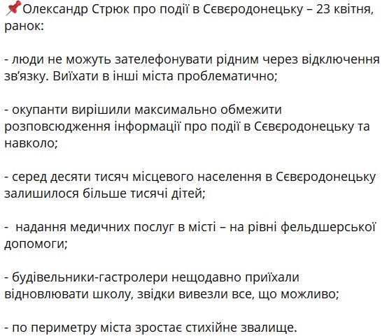 За словами Стрюка, люди не можуть зателефонувати рідним через відключення зв'язку, виїхати до інших міст проблематично. Крім того, додає він, окупанти вирішили максимально обмежити поширення інформації про події у Сєвєродонецьку та навколо.