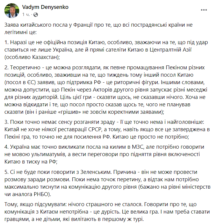 "Україна має точно викликати посла на килим у МЗС, але треба говорити не мовою ультиматумів, а вести переговори про підвищення рівня включеності Китаю в тиск на РФ", - пише Денисенко.