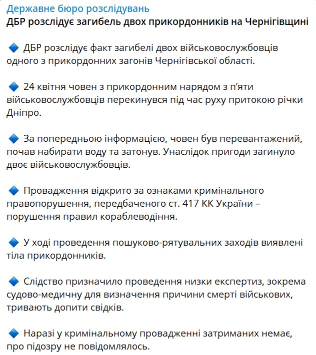 24 квітня човен з прикордонним нарядом із п'яти військовослужбовців перекинувся під час руху по притоку річки Дніпро. За попередньою інформацією, човен був перевантажений і почав набирати воду.