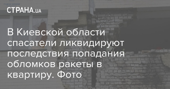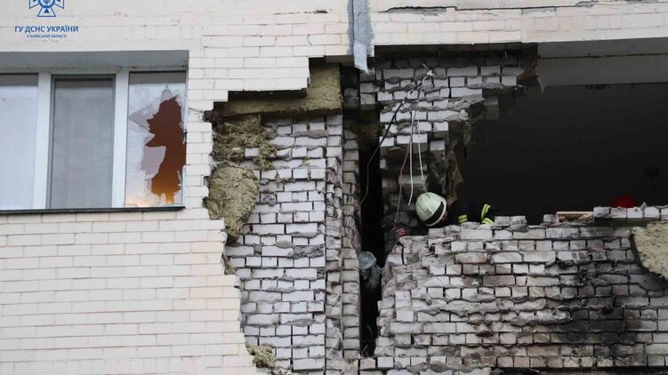 На Київщині рятувальники ліквідують наслідки попадання уламків ракети у квартиру. Фото