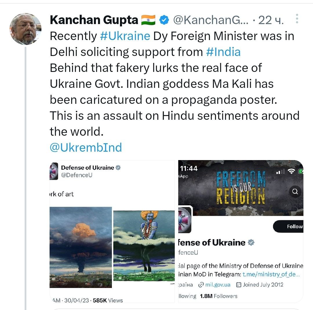 За цією фальшивкою ховається справжня особа уряду України. Індійська богиня Ма Калі була зображена карикатурно на пропагандистському плакаті. Це напад на індуїстські настрої у всьому світі", - написав у Твіттері старший радник індійського Мінінформу Каншан Гупта.
