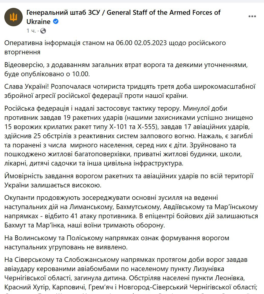 Минулої доби противник завдав 19 ракетних ударів. Збито 15 ракет типу Х-101 та Х-555. Також відбито 41 наземну атаку противника.