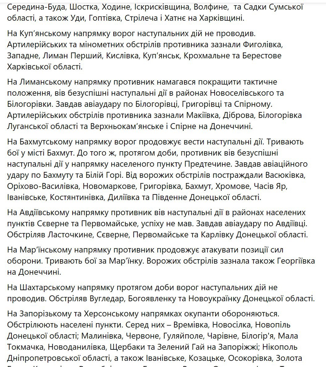 Продовжуються бої за Бахмут, також були спроби наступу на Предтечине. Росіяни завдали авіаударів по Бахмуту та Білій Горі.