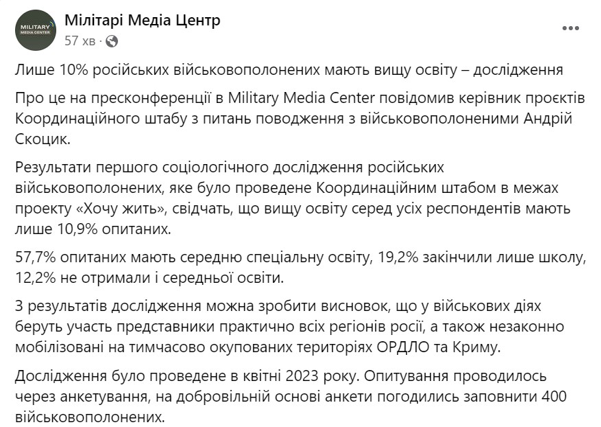 Серед російських військовополонених вищу освіту має лише 10,9%.