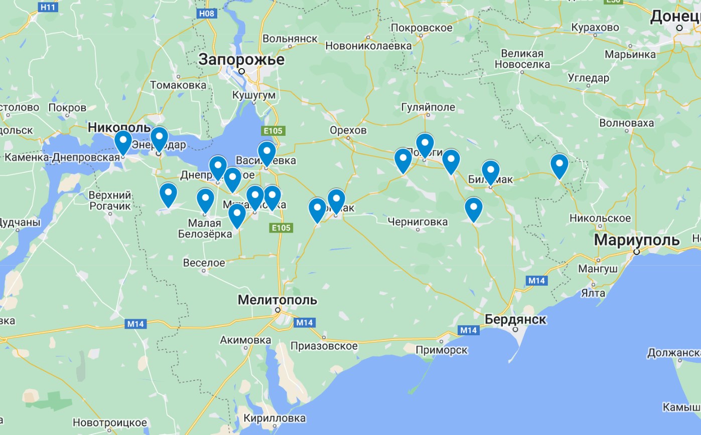 А саме: Тимошівка, Смирново, Тарасівка, Орлянське, Молочанськ, Куйбишеве, Пришиб, Токмак, Мала Білозерка, Василівка, Велика Білозерка, Дніпрорудне, Михайлівка, Кам'янка-Дніпровська, Енергодар, Пологи, Кінські Розбрати, Розівка.
