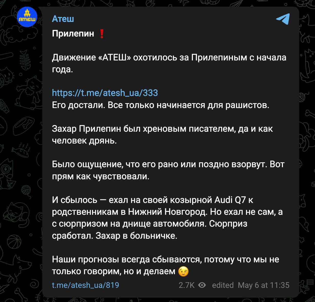 За їхніми даними, Прилєпін їхав до родини до Нижнього Новгорода в автомобілі на задньому сидінні, вибуховий пристрій спрацював під днищем машини.
