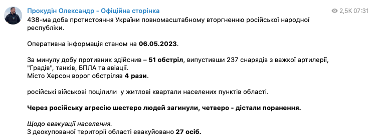 РФ здійснила 51 обстріл області, випустивши 237 снарядів із важкої артилерії, "Градів", танків, БПЛА та авіації. Херсон обстріляли чотири рази.